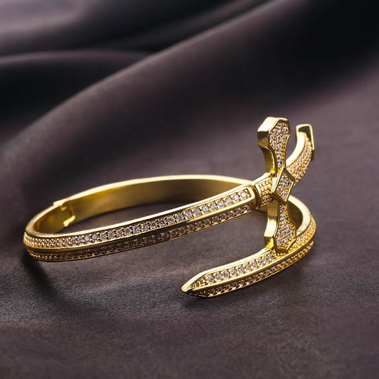 Iced Out Bling Cubic Zirconia CZ Cross Sword Bracelet for Men Boy Open Size Gold Color Sword of Justice Bangle Hiphop Jewelry US